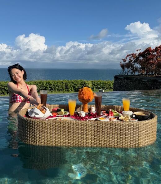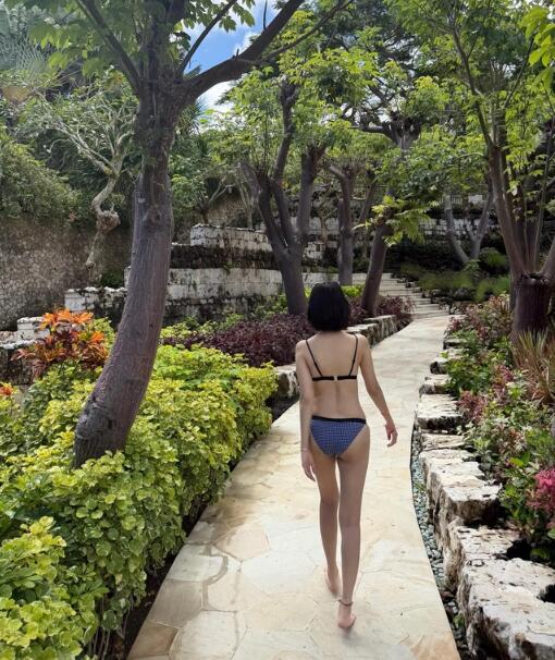 수영장 끝자락에 누워 에메랄드빛 물결과 하나가 된 듯한 포즈를 취하는가 하면, 최근 휴양지 트렌드인 ‘플로팅 조식’을 즐기며 럭셔리한 분위기를 연출하기도 했다. 맑은 하늘과 푸른 식물들이 어우러진 정원에서는 특유의 청순한 미소와 함께 장난기 넘치는 표정을 지어 보여 매력을 더했다.